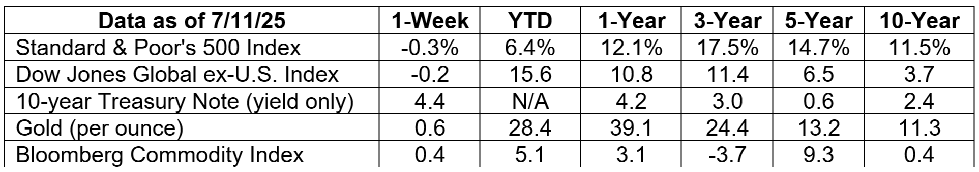 “Record highs and down weeks don’t typically go together, but the declines themselves are relatively minuscule, especially given the tariff headlines generated during the week—the possibility of 50 [percent] levies on Brazil and 35 [percent] on Canada, among others, if negotiations don’t go well—and continued attacks on Federal Reserve Chair Jerome Powell. The S&P 500, after all, is still up 26 [percent] from its April low and has gained 6.4 [percent] this year,” reported Jacob Sonenshine of Barron’s.