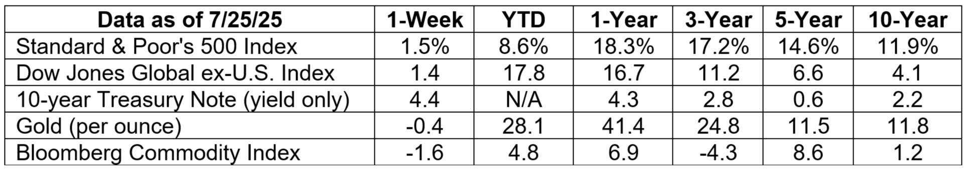 Last week, the Standard & Poor’s 500 Index closed at a new high every day, reported Connor Smith of Barron’s. (On June 30, 33 percent of the index was invested in technology stocks.) The Dow Jones Industrial Average and Nasdaq Composite also finished higher. Yields on U.S. Treasuries were mixed over the week.