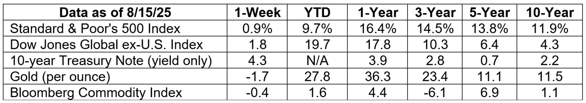S&P 500, Dow Jones Global ex-US, Gold, Bloomberg Commodity Index returns exclude reinvested dividends (gold does not pay a dividend) and the three-, five-, and 10-year returns are annualized; and the 10-year Treasury Note is simply the yield at the close of the day on each of the historical time periods. Sources: Yahoo! Finance; MarketWatch; djindexes.com; U.S. Treasury; London Bullion Market Association. Past performance is no guarantee of future results. Indices are unmanaged and cannot be invested into directly. N/A means not applicable.