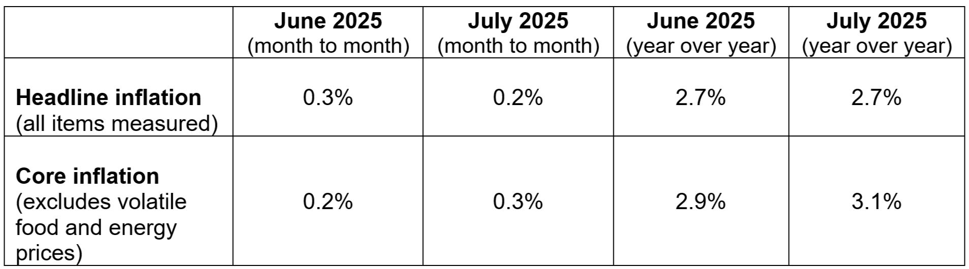 Headline inflation moved slightly lower, on a month-to-month basis (from June to July). It remained steady year over year, which is the 12-month period through July 2025. In contrast, core inflation, which excludes volatile food and energy prices, moved slightly higher on a month-to-month basis (from June to July). It increased year over year.