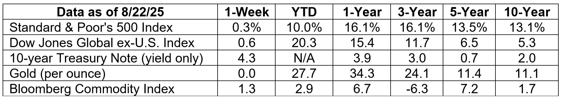 S&P 500, Dow Jones Global ex-US, Gold, Bloomberg Commodity Index returns exclude reinvested dividends (gold does not pay a dividend) and the three-, five-, and 10-year returns are annualized; and the 10-year Treasury Note is simply the yield at the close of the day on each of the historical time periods. Sources: Yahoo! Finance; MarketWatch; djindexes.com; U.S. Treasury; London Bullion Market Association. Past performance is no guarantee of future results. Indices are unmanaged and cannot be invested into directly. N/A means not applicable.