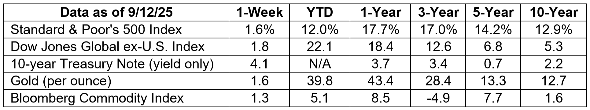 S&P 500, Dow Jones Global ex-US, Gold, Bloomberg Commodity Index returns exclude reinvested dividends (gold does not pay a dividend) and the three-, five-, and 10-year returns are annualized; and the 10-year Treasury Note is simply the yield at the close of the day on each of the historical time periods. Sources: Yahoo! Finance; MarketWatch; djindexes.com; U.S. Treasury; London Bullion Market Association. Past performance is no guarantee of future results. Indices are unmanaged and cannot be invested into directly. N/A means not applicable.